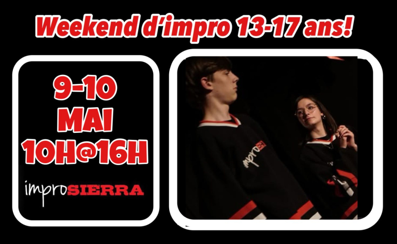 Le weekend pour les 13-17 ans est de retour ce printemps. Il aura lieu les 9 et 10 mai prochains de 10h@16h. Un weekend complet à développer et à travailler en profondeur les différentes facettes du jeu de l’impro. Le weekend est dirigé par Alexis Paquette. Le nombre de place est limité. Inscriptions ICI.